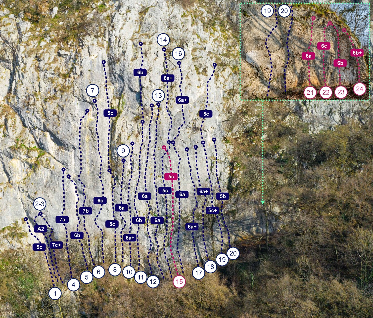 La cinquantina di vie presenti si distribuiscono tra i due settori principali: quello alto, con vie prevalentemente di sesto grado su placche e bombé tecnici di buchi e tacche, spesso abbinate a secondi tiri consigliatissimi (con corda da 80 metri!); quello basso con vie prevalentemente di settimo e di qualche ottavo grado, tecnicissime, intense e di resistenza, adatte a dita allenate alla sofferenza tipica di chi stringe le micro-tacche.
